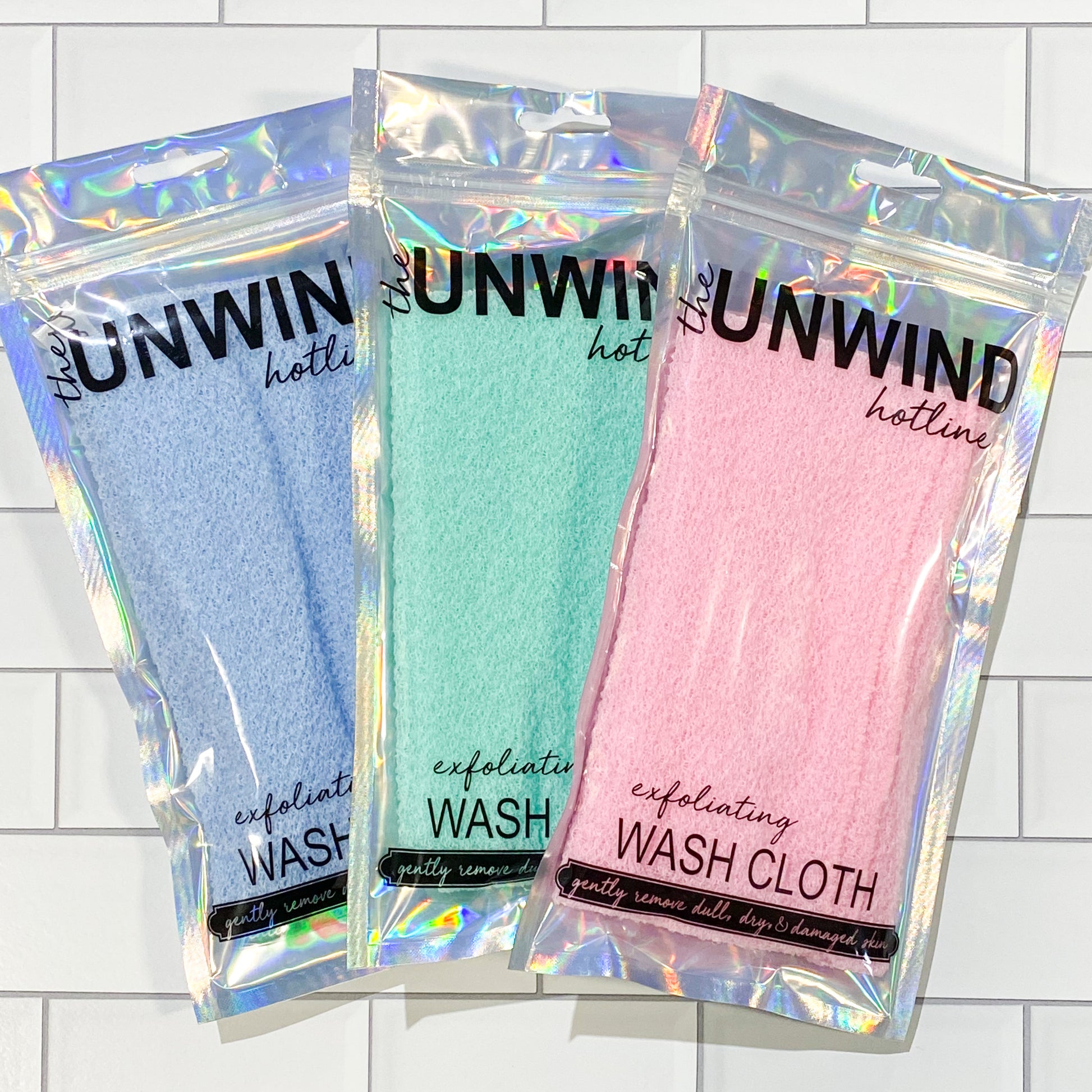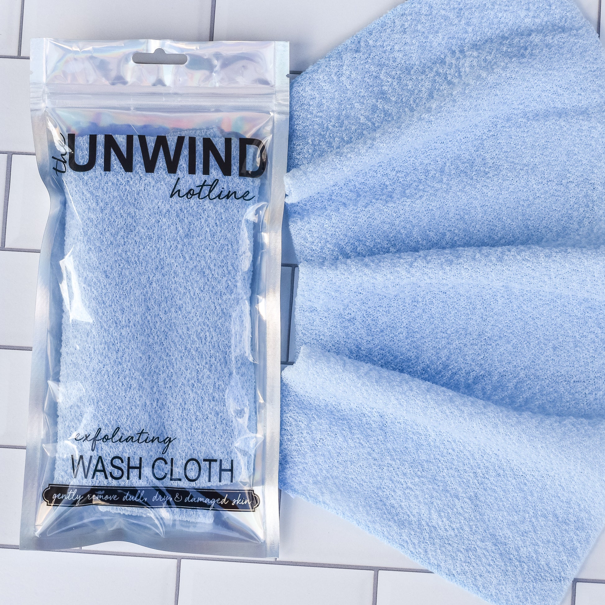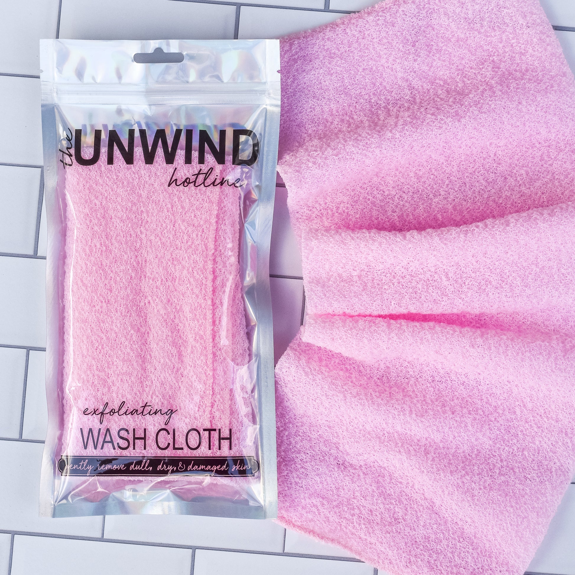 Gently exfoliate away dull, dry, and damaged skin to create a silky smooth feeling with The Unwind Hotline's Exfoliating Wash Cloth.