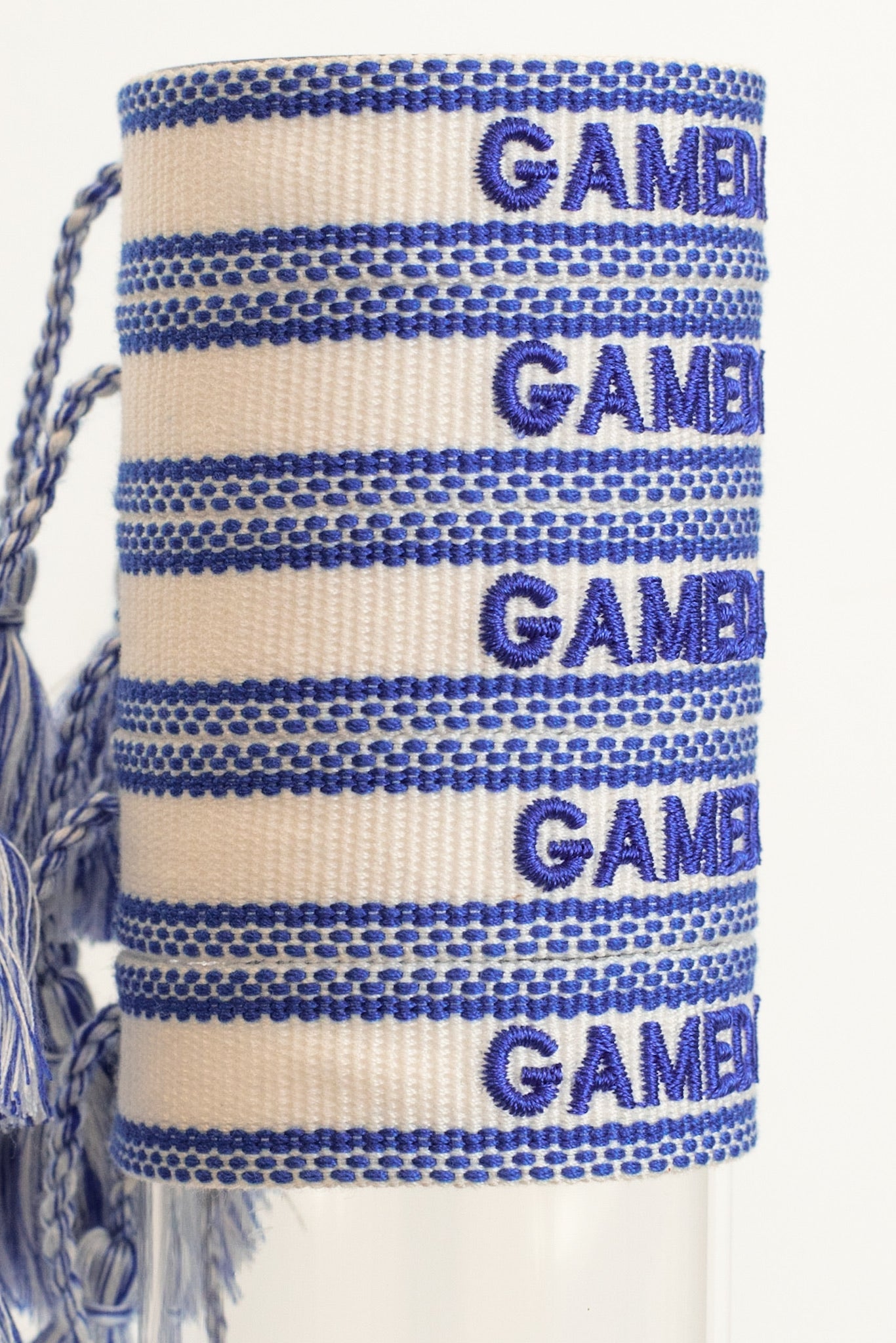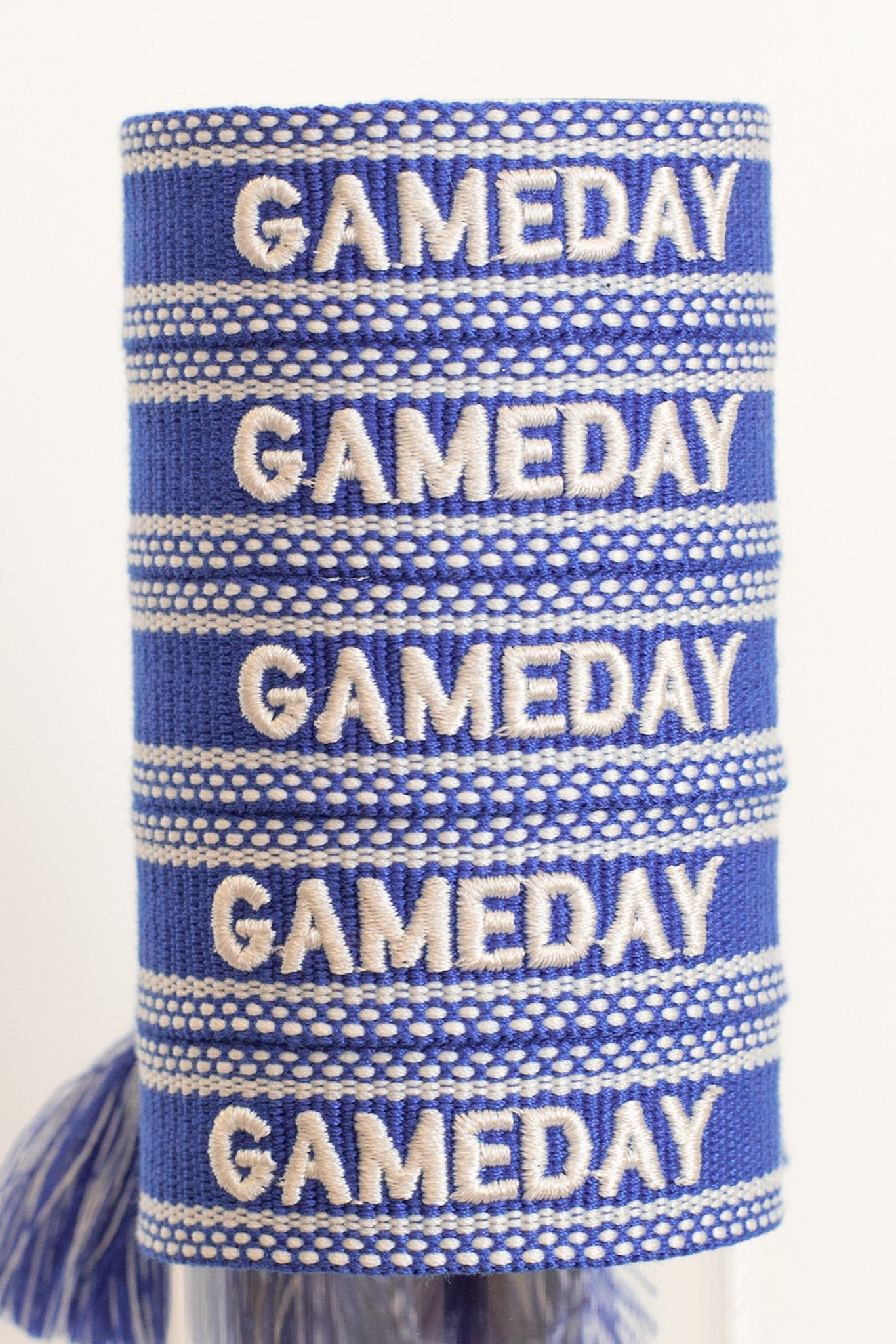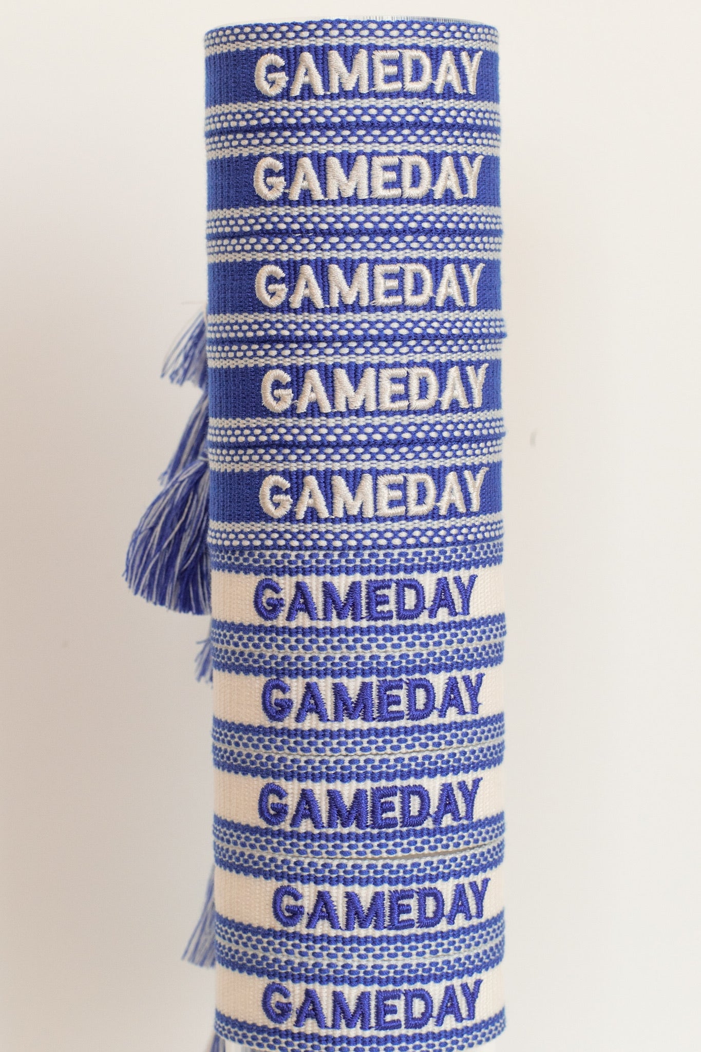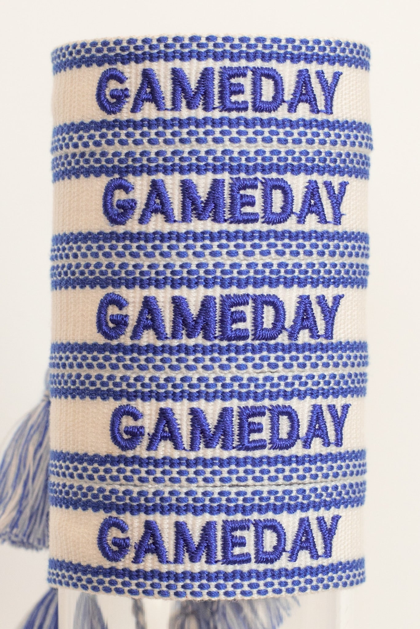 Colors are listed as "BASE BRACELET COLOR / STITCHING COLOR" so "White/Blue" is the white bracelet with blue GAMEDAY stitching.